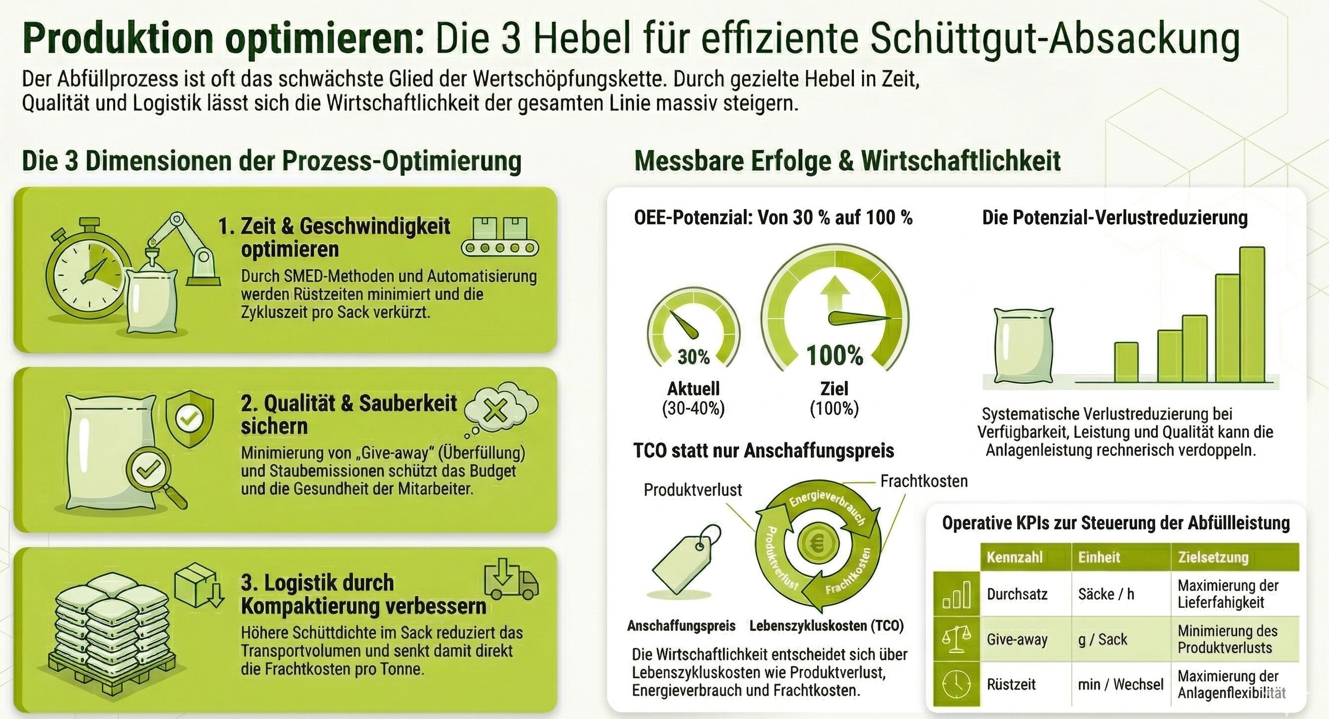 Die vorangegangenen Abschnitte haben die wichtigsten Hebel im Überblick gezeigt. Die verlinkten Fachartikel vertiefen jeden einzelnen – von der Lean-Methodik über die Prozesskennzahlen bis zur Physik des Schüttguts im Sack.